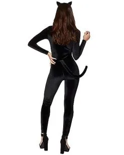 MEOW! This all-black catsuit will turn you into a fierce feline in no time at all! The velour jumpsuit comes complete with an attached tail for the ultimate look. Add the included cat ear headband and get ready to take on Halloween night!