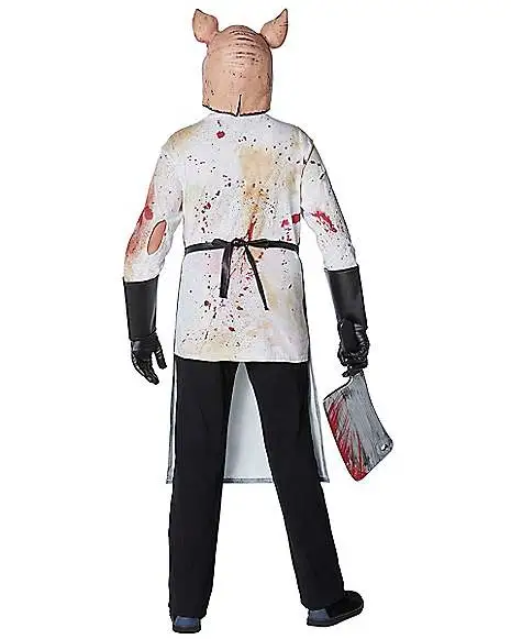 Oink oink! It’s the dreaded pig butcher! This frightening costume will transform you into the scariest butcher in town. Featuring a pig mask, tie-back apron, long butcher’s gloves, and a meat cleaver prop, this pig butcher ensemble will chop its way into your nightmares.