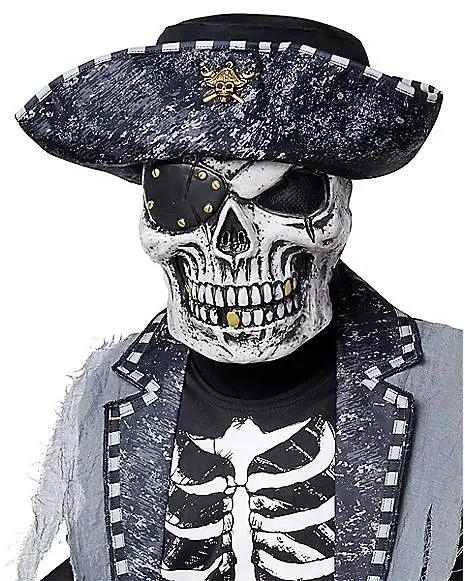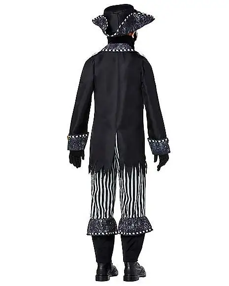 Transform into the deadliest pirate in history and haunt the seven seas when you wear this Kids Skeleton Pirate Costume this Halloween. Featuring a jacket with an attached skeleton shirt, pants, and a skull half mask, you’ll be screaming “YO HO!” all Halloween long. Put on the included pirate hat and gloves to complete the look!