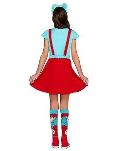 Your tween will be the cutest thing on the block this Halloween! This adorable thing one and thing two jumper comes with a blue t shirt and red overall jumper. Two front slash pockets feature a screen print graphic of thing one and thing two for added character detail! Matching headband with faux fur blue hair and red and white bows top of this adorable look!